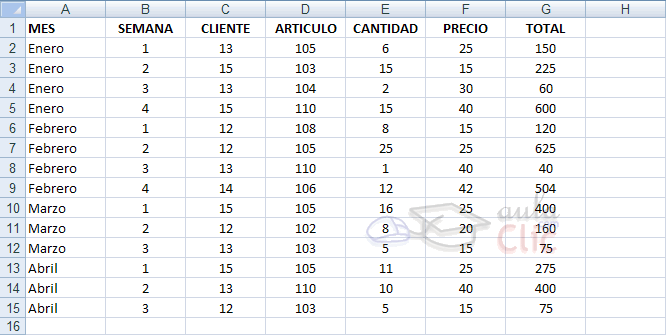 4 Selecciona el rango A1:G15. 5 Haz clic en el botón Tabla dinámica de la pestaña Insertar. 6 La opción Seleccione una tabla o rango debería estar marcada y con el rango A1:G15 en la caja de texto. 7 Marca Nueva hoja de cálculo. 8 Pulsa en Aceptar. 9 Se abrirá el panel lateral de tablas dinámicas. 10 Arrastra el campo SEMANA a 11 Arrastra el campo CLIENTE a 12 Arrastra el campo TOTAL a 13 Arrastra el campo ARTICULO a El campo ARTICULO se añadirá a los rótulos de columna, vamos a cambiar esto porque o queremos en los rótulos de fila.