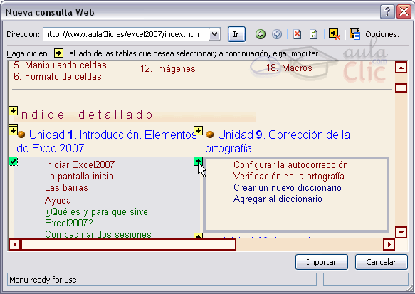Para elegir las tablas, basta con pulsar sobre las flechas. En el botón Opciones... de esta ventana, podremos elegir por ejemplo, si importar o no el formato de la tabla. Ten en cuenta que aunque no se vean los bordes, la mayoría de las webs están estructuradas con tablas. Una vez finalizada la elección, pulsamos Importar.