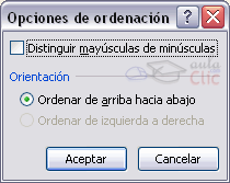 Seleccionando un nivel, y pulsando las flechas hacia arriba o hacia abajo, aumentamos o disminuimos la prioridad de ordenación de este nivel. Los datos se ordenarán, primero, por el primer nivel de la lista, y sucesivamente por los demás niveles en orden descendente. En la parte superior derecha tenemos un botón Opciones..., este botón sirve para abrir el cuadro Opciones de ordenación dónde podremos especificar más opciones en el criterio de la ordenación.