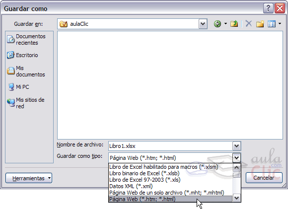 - En el cuadro de diálogo Guardar como tipo tendremos que seleccionar el tipo Página Web en Guardar como tipo: . En esta pantalla disponemos de dos posibles modos de guardar la página Web: Una vez hayamos elegido la opción que más nos interesa según nuestras necesidades podemos pulsar sobre Guardar y tendremos nuestra hoja Excel guardada como una página web con la extensión .htm en lugar del clásico .xls. Una vez tenemos nuestra hoja convertida a formato html tendremos que subirla a un servidor de Internet para que pueda ser vista por los internautas.