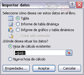 Veremos entonces la misma ventana que con Access, donde elegir si importar en la hoja o en una nueva, y donde podremos modificar en Preferencias las opciones de actualización de la conexión.